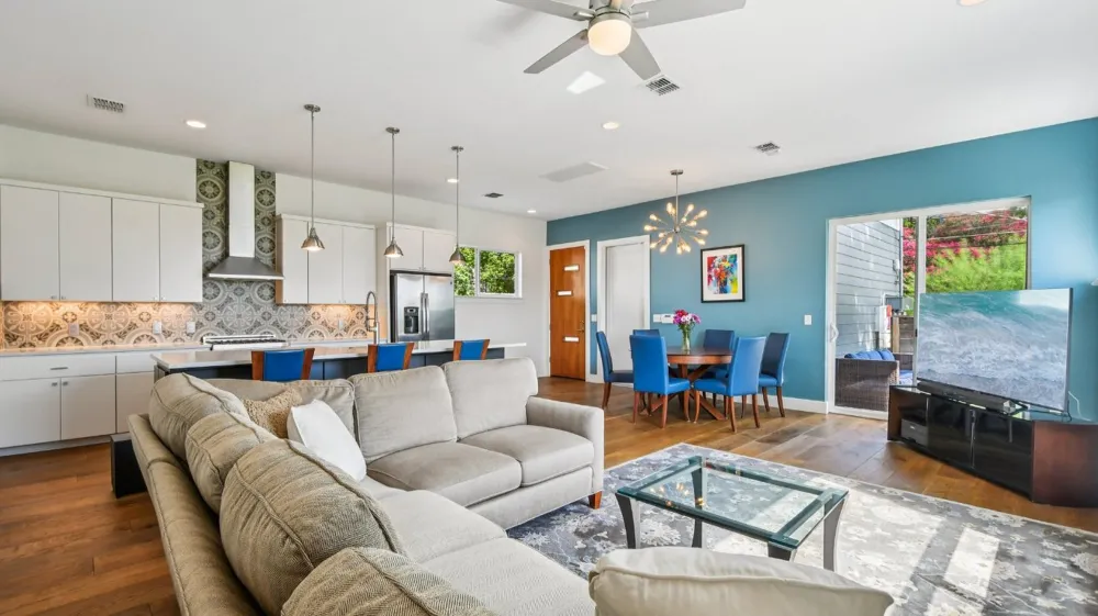 Discover modern living at its finest in this stunning four-bedroom, three-bathroom East Austin home featuring 2,136 square feet of thoughtfully designed space. This contemporary home showcases an open floor plan that seamlessly connects living areas, while soaring vaulted ceilings create an impressive sense of airiness throughout. Upstairs, you'll find a second living area that serves as an ideal family retreat, home office, or entertainment space, with views overlooking the park. The heart of the home features a chef's kitchen equipped with quartz countertops, custom cabinetry and upgraded stainless steel appliances that provides both style and functionality. Natural light floods every corner through strategically placed windows, highlighting the beautiful white oak flooring. The home features a spacious en-suite owner's suite upstairs with a walk-in closet and walk-out covered balcony. One bedroom and full bath also available on the first floor. The eco-conscious features include an owned solar system, metal roof, and xeriscape landscaping - ensuring energy efficiency while maintaining comfort year-round. Enjoy the outdoors with a fenced yard with a back patio. This thoughtfully planned residence sits in a vibrant East Austin neighborhood with convenient access to parks, walking trails, swimming pool, pickleball/tennis courts and numerous restaurants, coffee shops and bars. Just a short commute to downtown or UT by bus or bike. With its blend of contemporary design elements, practical amenities, and prime location, this exceptional home offers the perfect foundation for comfortable Austin living.