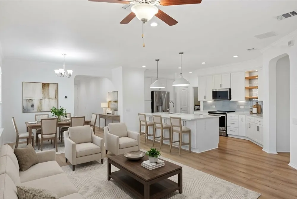 This thoughtfully updated South Austin home offers rare flexibility with four bedrooms, three distinct living areas, and a primary suite on the main level, all within a spacious two-story layout enhanced by substantial updates throughout. The main floor features the primary bedroom with a spa-like bath including dual vanities, a jetted tub, separate shower, along with an open, light-filled living space centered around a kitchen rebuilt from the studs up with quartz countertops, a large island, sleek cabinetry with pull-out storage, recessed and cabinet lighting, and wide-plank luxury vinyl flooring throughout. Upstairs are three additional bedrooms with generous closets and two versatile living areas, one of which can easily convert to a fifth bedroom, home office, media room, or play space, offering exceptional flexibility for multigenerational living, remote work, or entertaining. Additional upgrades include an epoxy-coated garage floor, a new garage door motor, and a thoughtfully designed laundry room with butcher block counters, open shelving, and ceiling-height cabinetry, with the washer, dryer, and refrigerator conveying. Outdoor living includes a covered patio, private backyard, and storage shed. Neighborhood amenities complete the picture, with a community park, playgrounds, basketball court, and pool just blocks away, Blazier Elementary and a new daycare center within walking distance, a newly announced H-E-B nearby, land purchased for a future AISD high school, and convenient access to Goodnight Ranch, Easton Park, McKinney Falls, local shops and dining, and downtown Austin in under 20 minutes.